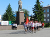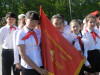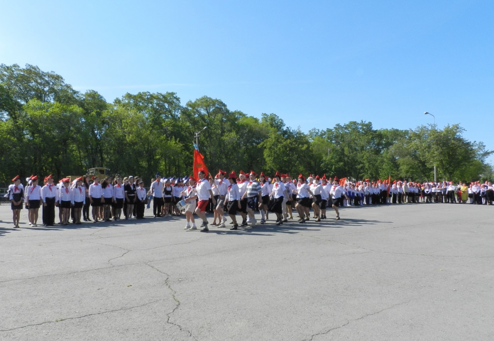 Затем все отряды под бой барабанов и задорные речевки прошли строем через площадь и спели пионерскую песню. Первыми маршем прошли ветераны пионерского движения - самый дружный и многочисленный отряд. Своим выступлением они задали тон празднику и показали пример школьникам.