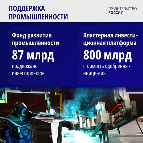 «Благодаря заключенным в прошлом году специальным инвестиционным контрактам будет привлечено более 170 млрд рублей на реализацию крупных индустриальных проектов. Это около 4 тыс. рабочих мест в 10 российских субъектах. Фонд развития промышленности профинансировал сотни инициатив на общую сумму порядка 87 млрд рублей. В рамках механизма кластерной инвестиционной платформы было одобрено еще более 20 проектов стоимостью свыше 800 млрд рублей», – сказал Михаил Мишустин.