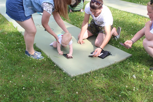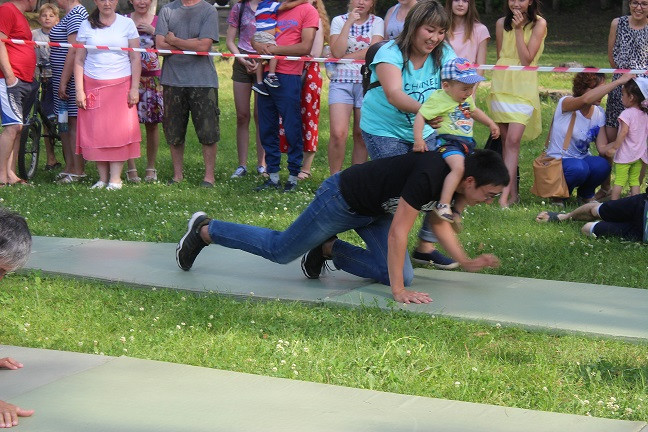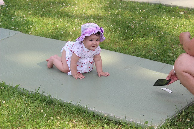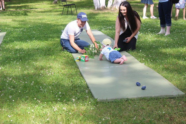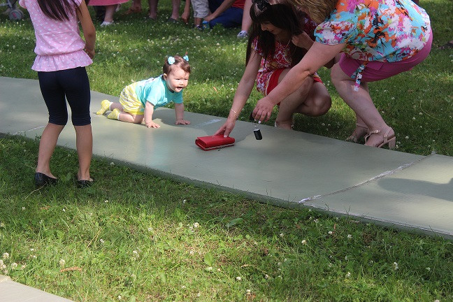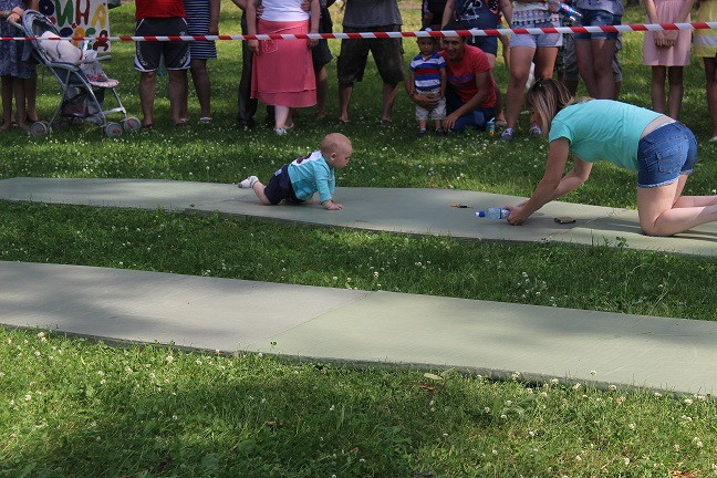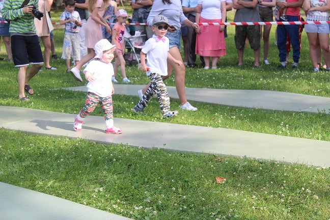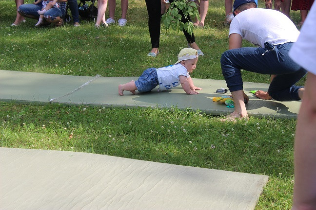 Начались соревнования с категории «Ползунки» - возраст малышей от 6 до 11 месяцев включительно. Малыши должны были проползти определенную дистанцию на время. Чем только родители не завлекали своих спортсменов! В ход шли любимые игрушки, бутылочки с молоком, так нравящиеся детям пульты и зарядные устройства для телефонов и даже веточки деревьев. Пока девочки красовались в своих нарядах и позировали фотографам, победитель соревнования Жеребцов Артем по - чемпионски быстро и уверенно прополз всю дистанцию, показав на финише лучшее время. Не менее зрелищной была борьба в категории «Бегунки» для малышей в возрасте от 1 года по 1,5 лет. Участникам предстояло пробежать отмеренную дистанцию и вернуться обратно. Все происходило настолько стремительно, что волонтерам пришлось побегать не меньше, чем спортсменам, чтоб зафиксировать показанные результаты. Некоторым участникам так понравилось выступать, что они прошли дистанцию по несколько раз под аплодисменты и овации присутствующих. В категории «Ванька-встанька» приняли участие дети от 1,5 до 2 лет совместно с папами или дедушками. Соревнование проходило в два этапа. Сначала взрослый член команды должен был проползти на четвереньках с ребенком на спине. Во второй части конкурса взрослому участнику команды предстояло качать на ноге своего малыша. По результатам двух этапов лучшее время показали сразу две команды. «Ванькой - встанькой» чемпионата стали Малев Лев и Валиуллина Арина.