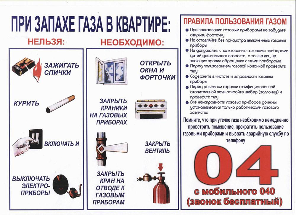 1. При обнаружении запаха газа в помещении необходимо немедленно перекрыть краны на опуске к приборам и на приборах, открыть окно и двери, создать сквозняк, вызвать аварийные службу по телефону 104. Не зажигать огня, не курить, не включать электроосвещение и электроприборы, не пользоваться электрозвонками, принять меры по удалению людей из загазованной зоны.