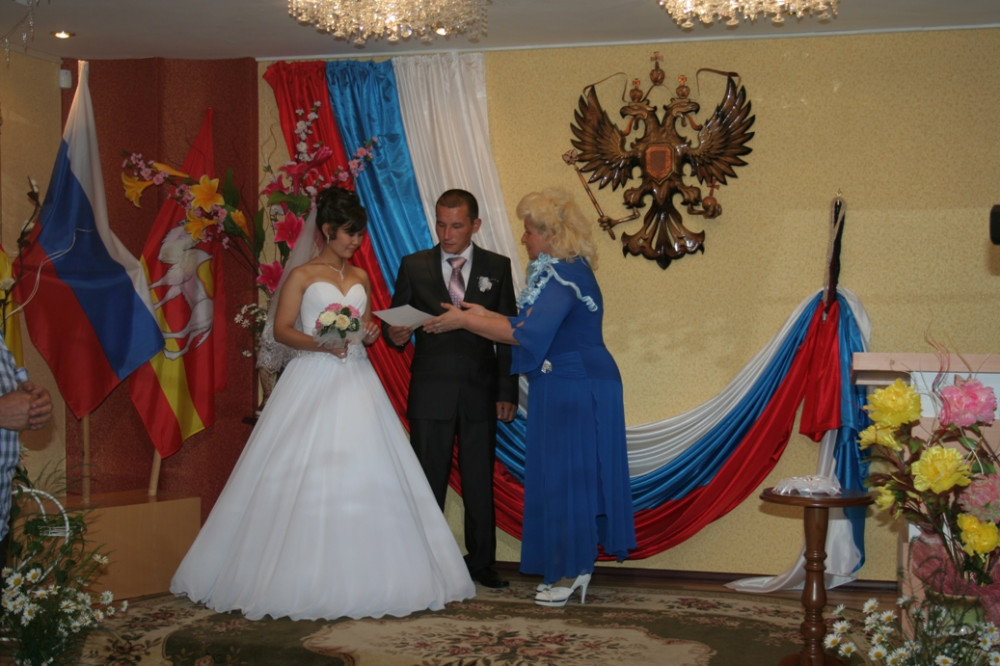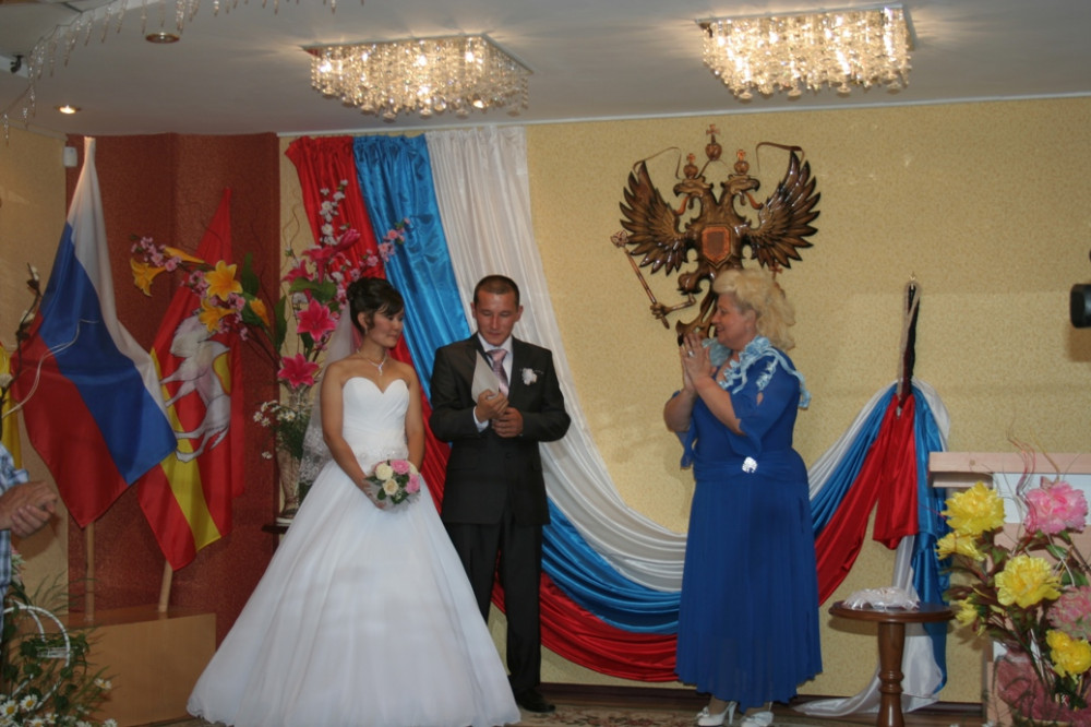 В этот красивый праздник помещение отдела ЗАГС было особенно красивым и торжественным. На крыльце и входной группе были красивые торжественные красные дорожки, вдоль дорожек установлены вазоны с ромашками. В зале торжеств также стояли большие вазы с ромашками.