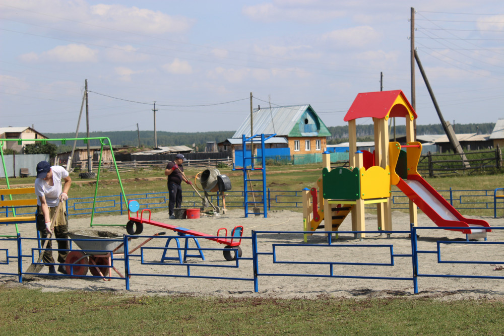 На фото: идут работы по благоустройству детской площадки в д. Куянбаева в 2019 году