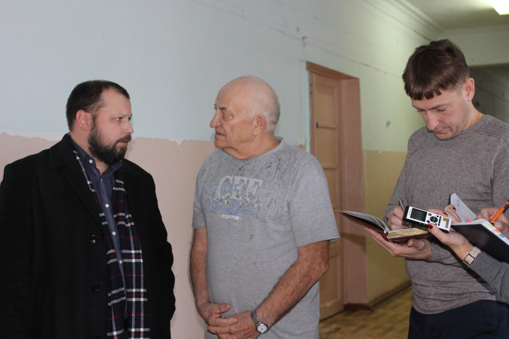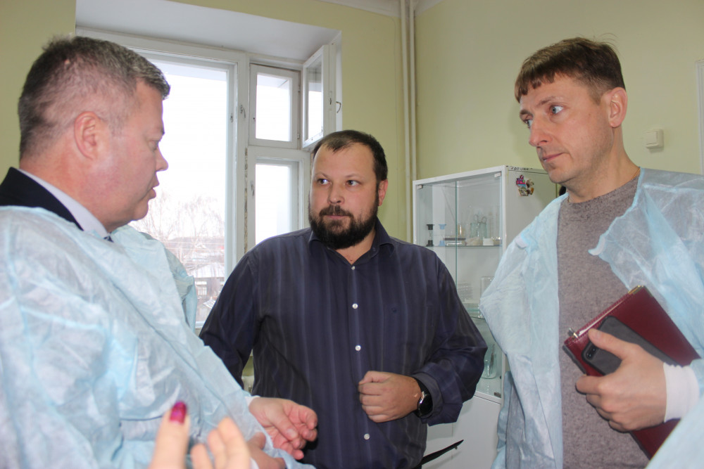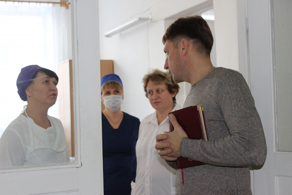 Следующей частью визита стало посещение районной больницы и встреча с коллективом. Так совпало, что в этот же день районное здравоохранение принимало коллег из Министерства во главе со вновь назначенным министром Юрием Семеновым. Министр осмотрел здание поликлиники, отделения стационара, детской поликлиники, пообщался с пациентами. Юрий Алексеевич увидел, в каких условиях работают фельдшеры и водители скорой помощи. Проблемы с обвалившейся штукатуркой потолка и неработающей канализации не ушли от внимания министерства. Как рассказал главный врач больницы Николай Панков, средства на ремонт этих помещений выделены, аукцион объявлен. Вопросы у персонала и пациентов вызывает количество машин скорой помощи в автопарке. На сегодняшний день их всего шесть на весь район.