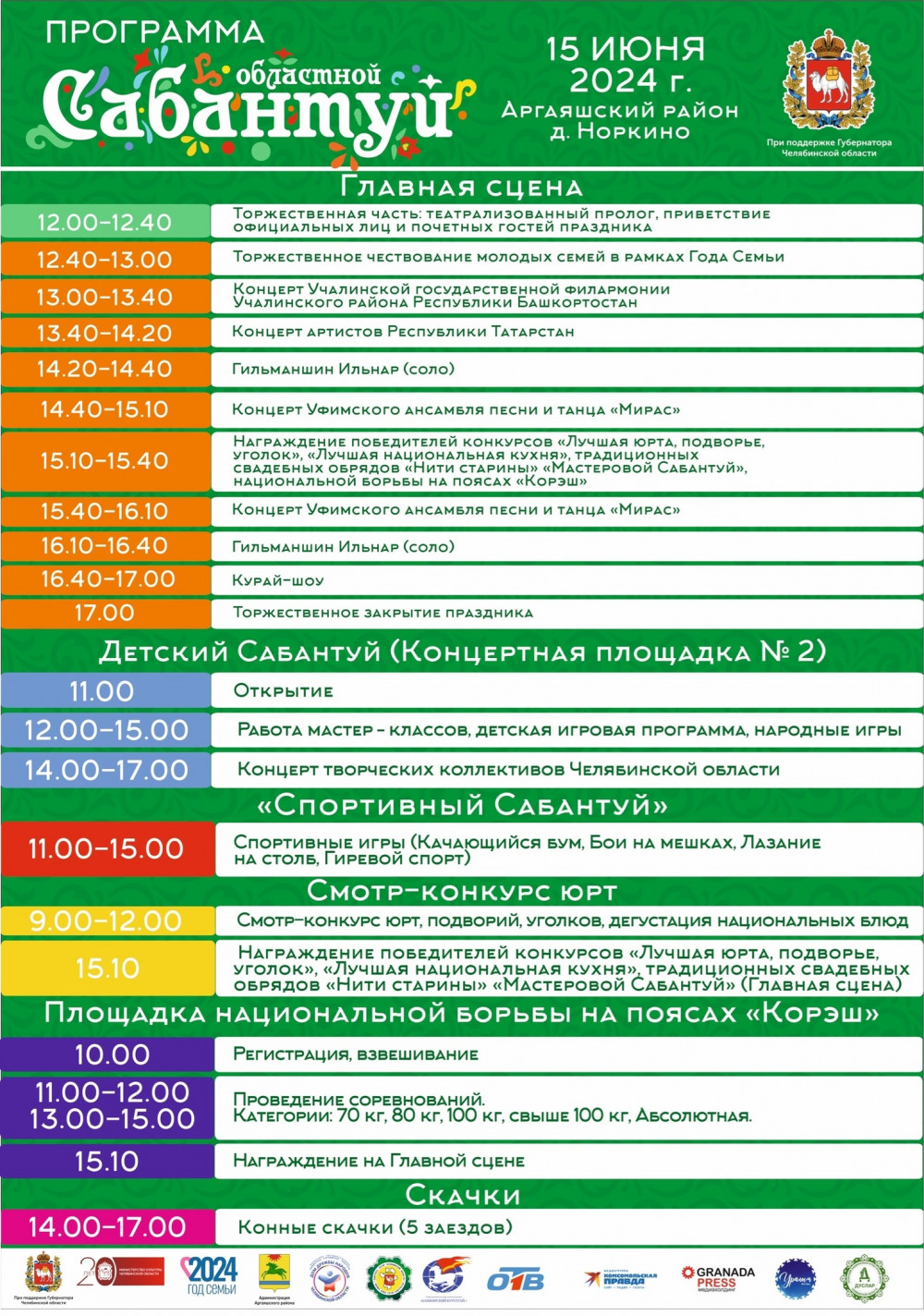 Как и принято на полюбившемся празднике, одновременно с традиционными мероприятиями (конкурс юрт и подворий, разнообразие национальной кухни), гости смогут окунуться в обрядовую культуру татарского, башкирского и казахского народов. 2024 год объявлен Годом семьи, а потому организаторы включили в конкурсную программу презентацию свадебных обрядов. Гостям предстоит увидеть колорит и самобытность тюркской свадьбы, узнать, как одевали невесту, какие угощения подавали и многое другое.