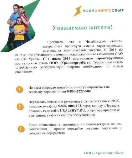 Сообщаем, что в Челябинской области завершилась процедура смены гарантирующего поставщика электрической энергии. С 2018 по 2019 гг. эти обязанности временно исполняла сетевая компания ОАО «МРСК Урала». С 1 июля постоянным гарантирующим поставщиком стало ООО «Уралэнергосбыт». Теперь оплачивать потребленную электрическую энергию необходимо по новым реквизитам.