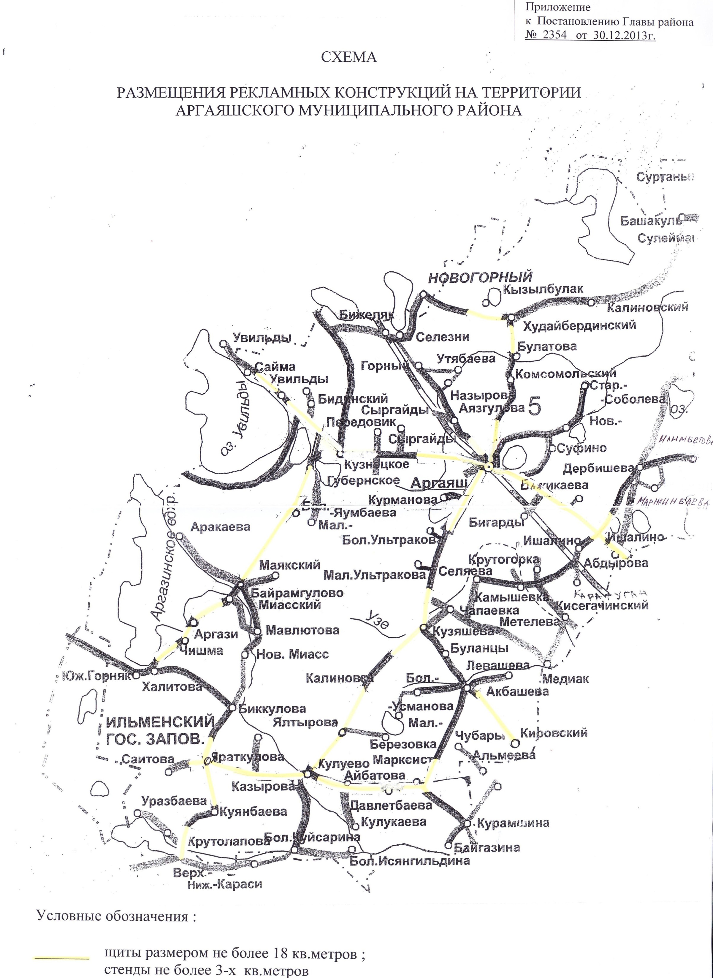 В схеме размещения рекламных конструкций на территории Аргаяшского муниципального района обозначены места расположения наружной рекламы с использованием щитов размером не более восемнадцати квадратных метров, выполненных в соответствии с техническим регламентом, стендов не более трех квадратных метров. Места установки рекламных конструкций обозначены условно на схеме сети автомобильных дорог Аргаяшского муниципального района. Предусматривается установка рекламных щитов , стендов по обе стороны автомобильной дороги при согласовании : с владельцами земельных участков , с соответствующими службами в установленном порядке.